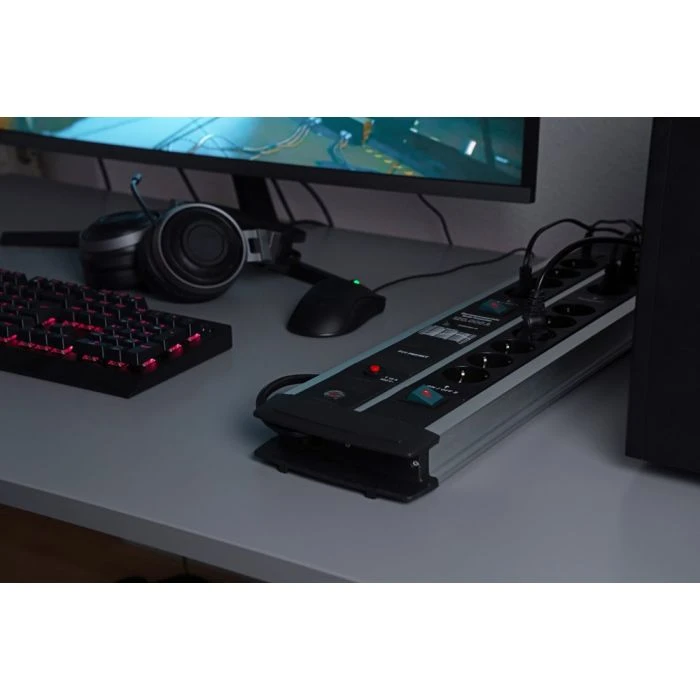 Beveiligd uw apparaten tegen storingen in het stroomnet zoals overspanningen, indirecte blikseminslagen of stroomstoten, tot een maximale afvoerstroom van 120.000 A. Hoogwaardige bescherming tegen hoogfrequente storingen door ingebouwde filter. Bijzonder stabiel geanodiseerde behuizing en schermt schadelijke, electromagnetische golven af. Intelligente, verwisselbare module bouw. 2 verlichte veiligheidsschakelaars, tweepolig aan en uit te zetten: 1x 4 stopcontacten, 1x 6 stopcontacten. 4 permanente stopcontacten. Stroombegrenzer 16 A. Laadstroom van max. 3100 mA, voor snel laadproces. 2 USB-laadaansluitingen, via 1 schakelaar te schakelen. Stopcontacten met hogere contactbescherming.